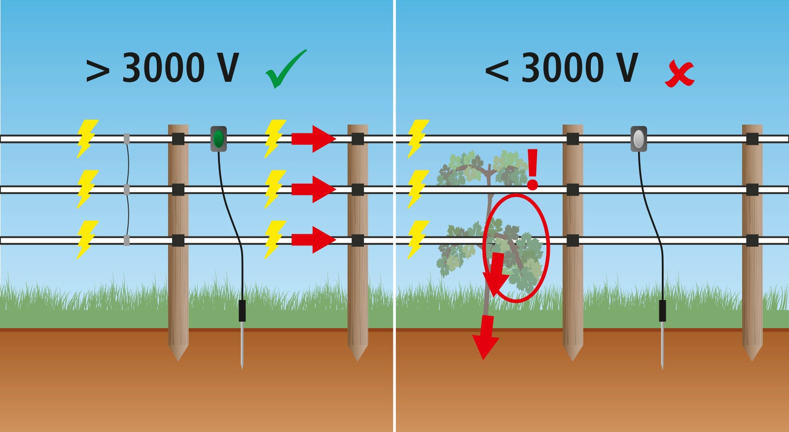 • under 3000 V light stops flashing and thereby shows that the fence is no longer safe